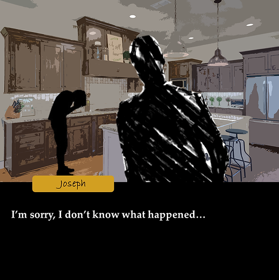 Joseph's silhouette stands hunched over as he holds his face in his hands. Across the kitchen is his Foster Father in a stern stance.